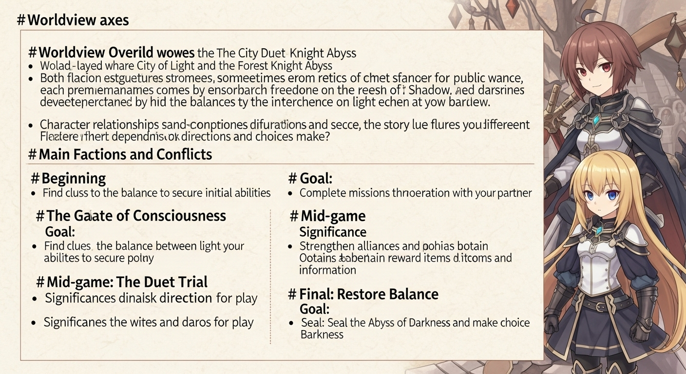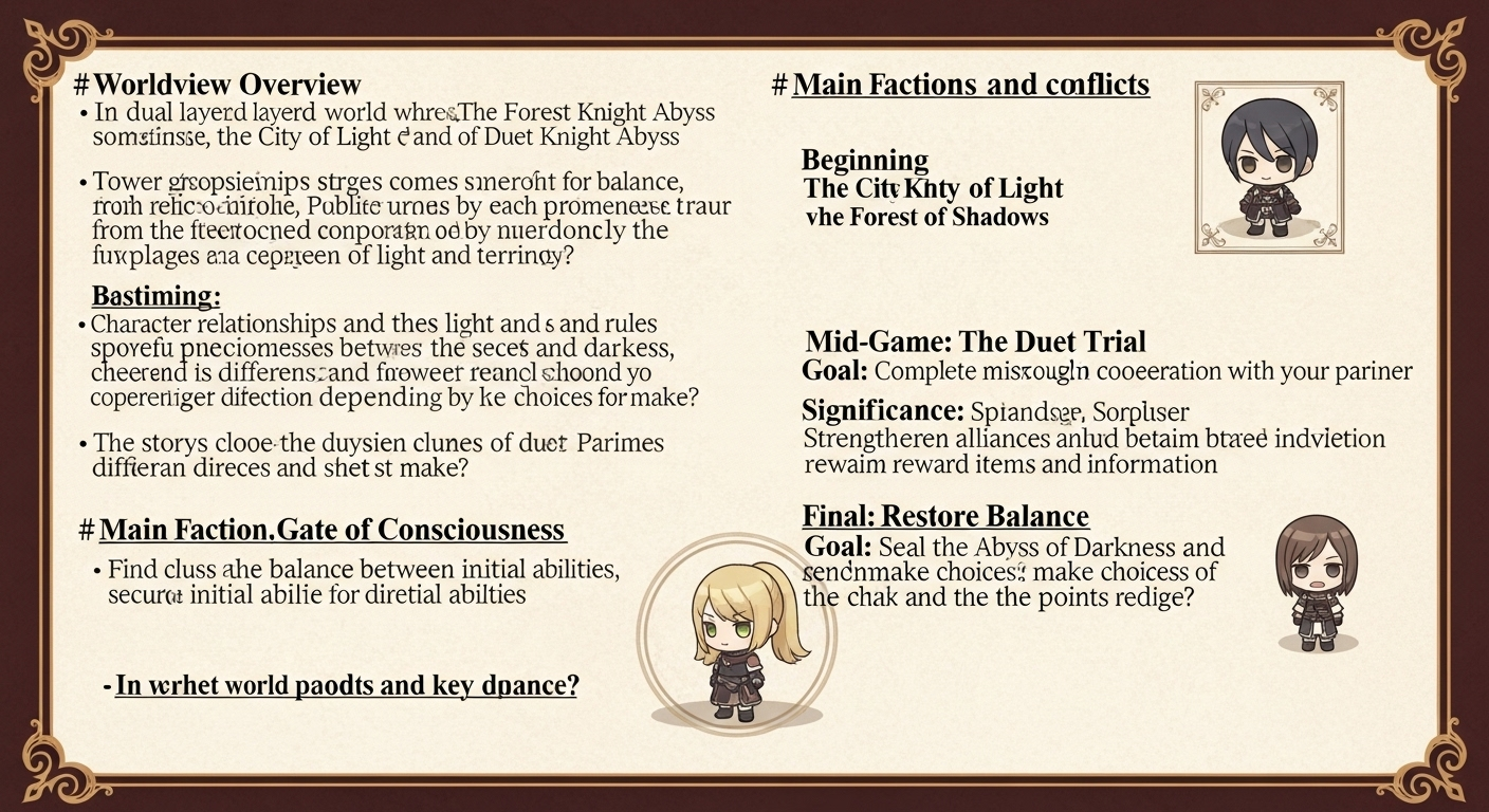 - 듀엣나이트 어비스는 빛의 도시와 그림자의 숲이 공존하는 이중 구조의 세계입니다. 두 진영이 균형을 이루려 하지만, 때로는 서로의 영역이 침범하며 불안이 확산됩니다.