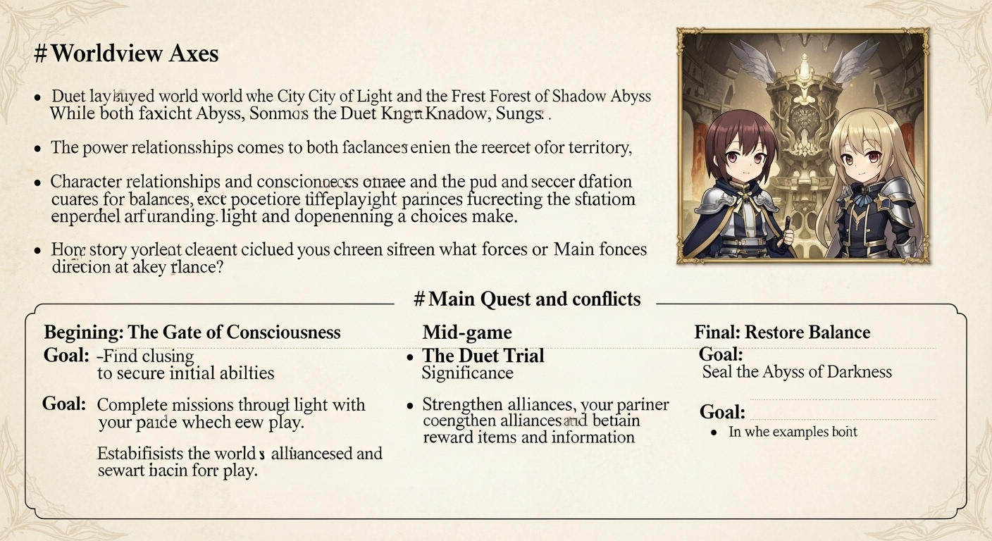 - 이 세계를 관통하는 힘은 듀엣나이트 어비스의 유물에서 비롯되며, 각 현상은 빛과 어둠의 상호 작용으로 설명됩니다.