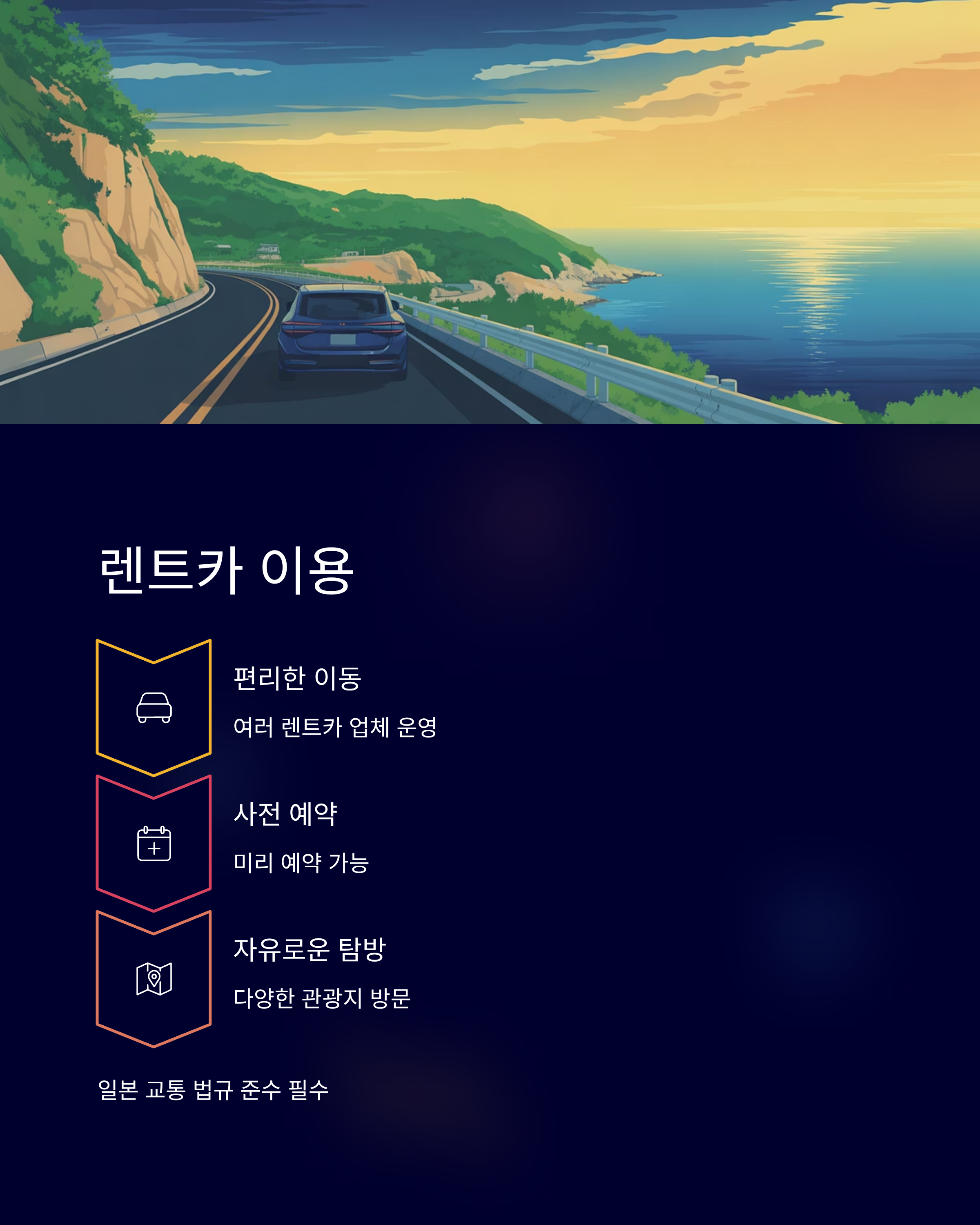 대마도에서의 이동은 렌트카를 이용하는 것이 편리합니다. 대마도에는 여러 렌트카 업체가 있으며, 사전 예약이 가능합니다. 렌트카를 이용하면 대마도의 다양한 관광지를 자유롭게 탐방할 수 있어 더욱 즐거운 여행이 될 것입니다. 운전 시에는 일본의 교통 법규를 준수하는 것이 중요합니다.